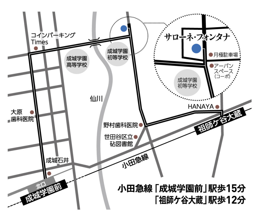 北口を出て正面の道をまっすぐ進み、6つ目の十字路(右手に赤いポスト)を右折。橋を越え右手に成城学園初等学校、その左手の青い屋根の建物になります。